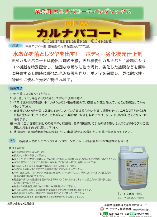 車両塗装面の頑固な水アカ汚れを落としながら、最高級のカルナバワックスにより深みのある光沢を出します。