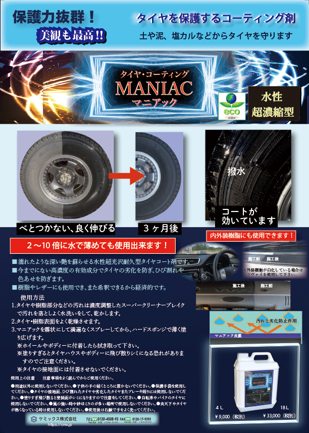 2〜10倍に水で薄めても使える水性最高級タイヤワックス。内外装樹脂部分にも使用できる最高を求めるマニアの為の一品。