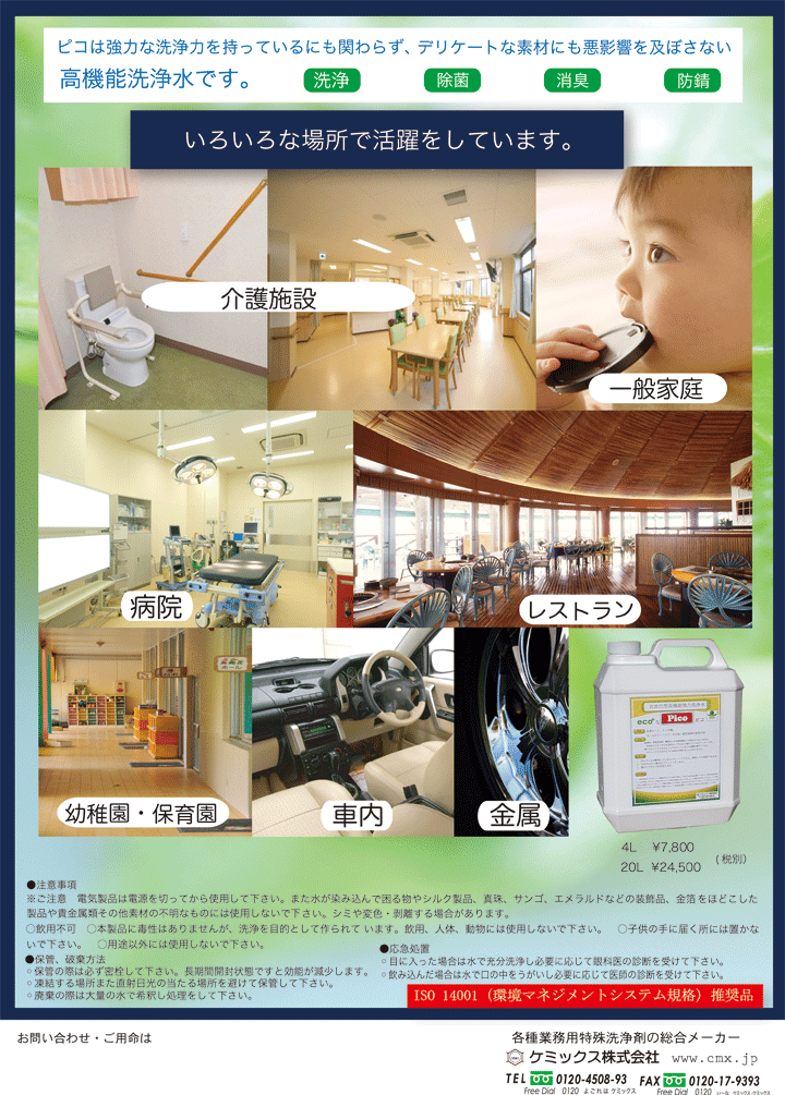 ★溶剤、界面活性剤、洗剤成分などの有害物質は一切含まれておりません。 自然水のイオンの力を活性化して作られた極めてエコなクリーナーです。 ★アルカリイオン水のようにアルミニウムなどの金属や食器類の上塗りクリヤーを侵すことなく、またナノバブル水のように洗浄力が落ちることがありません。