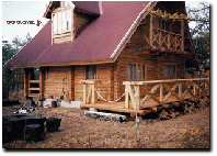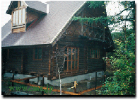 | 米松マシンカットのログハウス。無塗装放置が長く南面と西面の丸太は日に食われ表面は炭化状態でした。 | ほぼ新築状態になったが、日差し風雨とも激しく当たる場所なので少し濃いめ色で仕上げ。 | ||||||||||||||||||||||||||||||||||